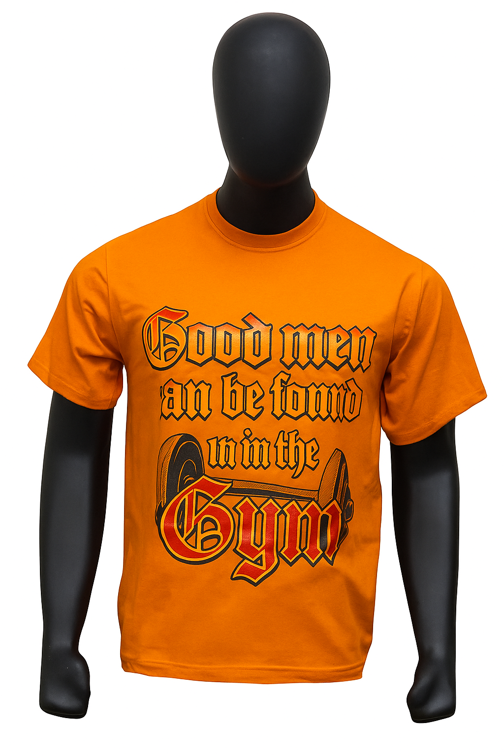 Stand out with bold style and gym pride in this vibrant orange graphic tee. Featuring the powerful slogan “Good men can be found in the Gym” in a gothic-inspired font, paired with a barbell design, this shirt makes a strong statement for fitness enthusiasts.